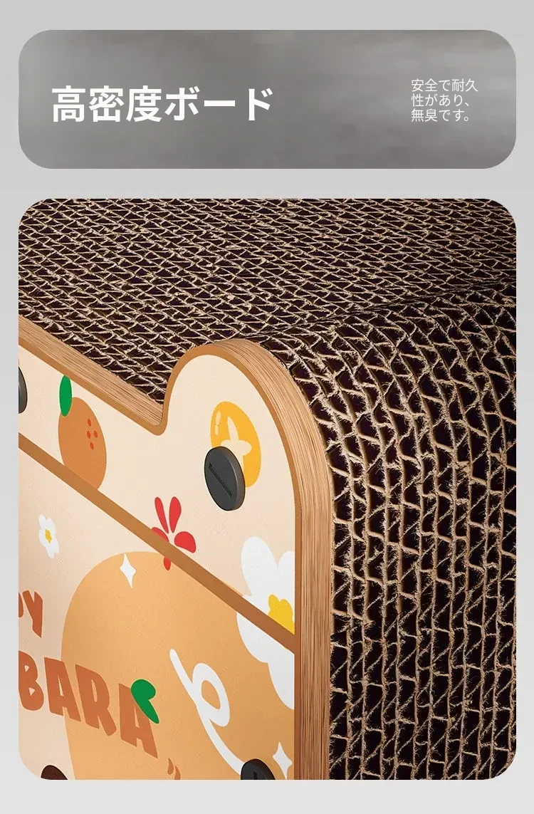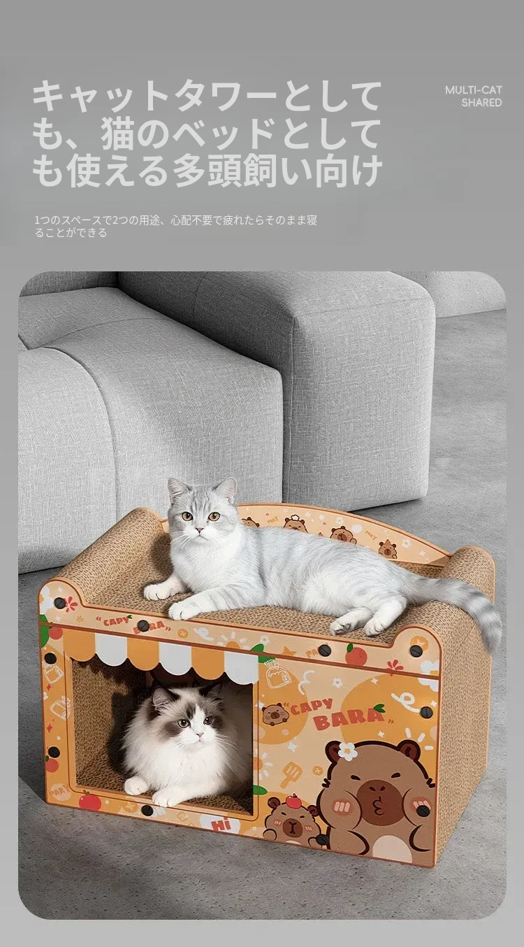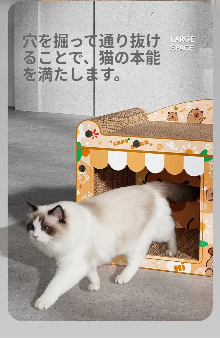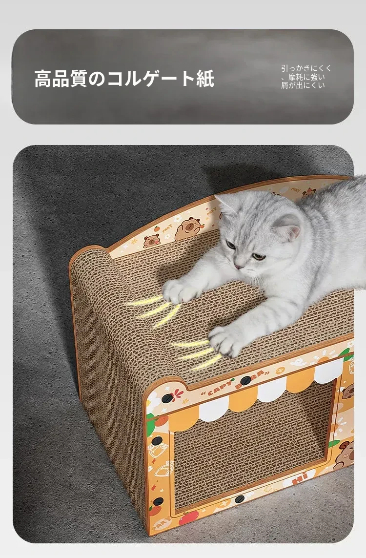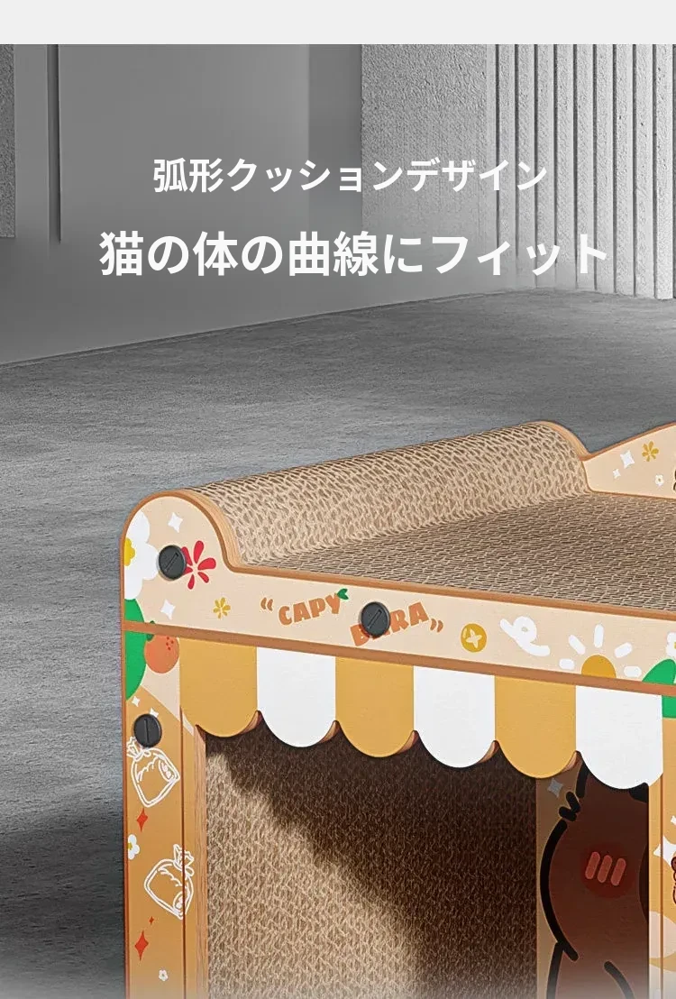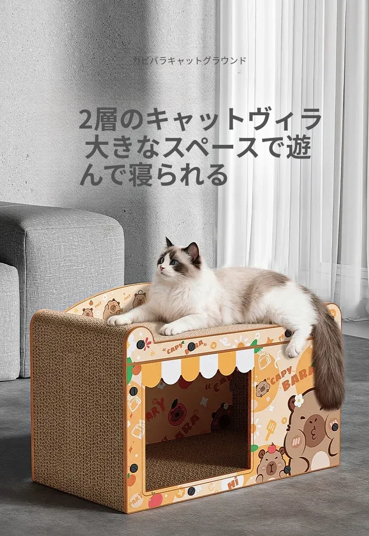 カピバラデザインの一体型キャットハウス&爪とぎボード!耐久性抜群、可愛いカートゥーンスタイルで、ソファを守りつつ猫ちゃんも大満足!波形段ボール製の楽しい猫おもちゃです。