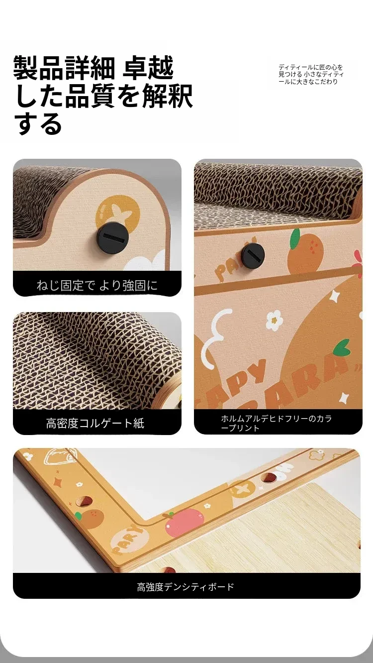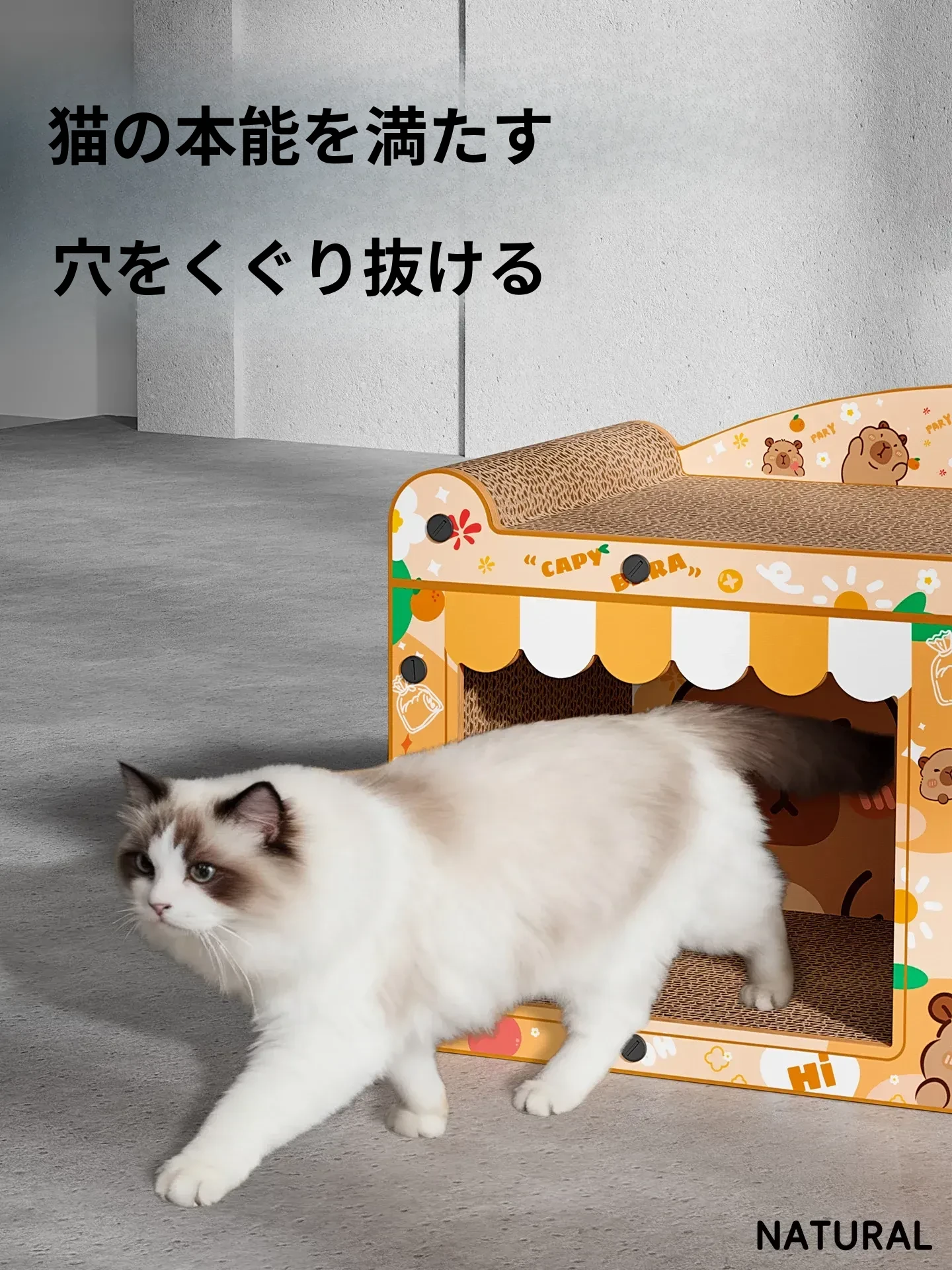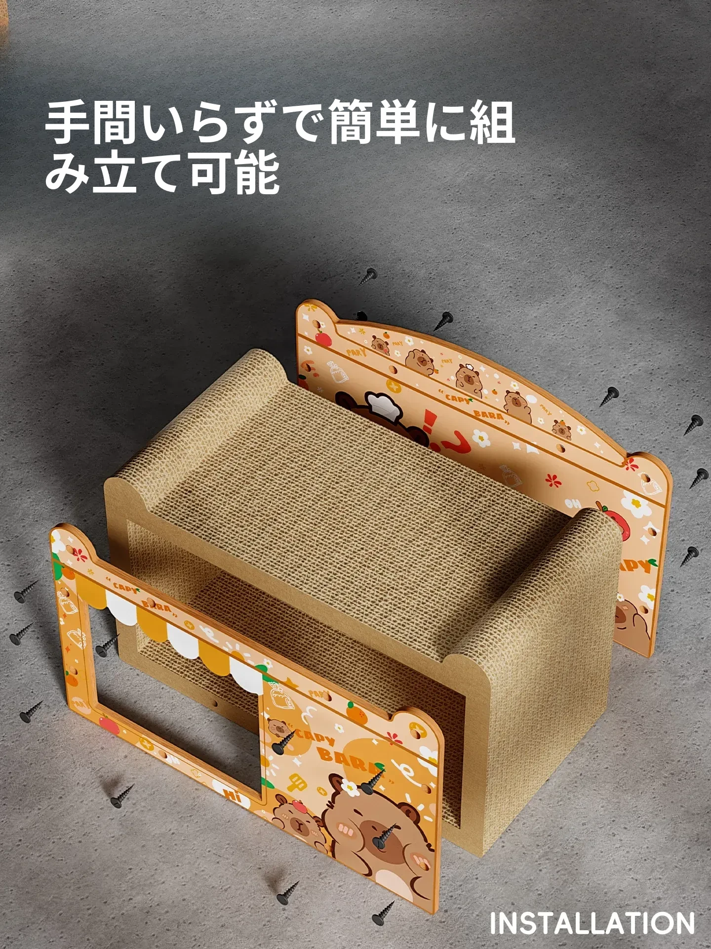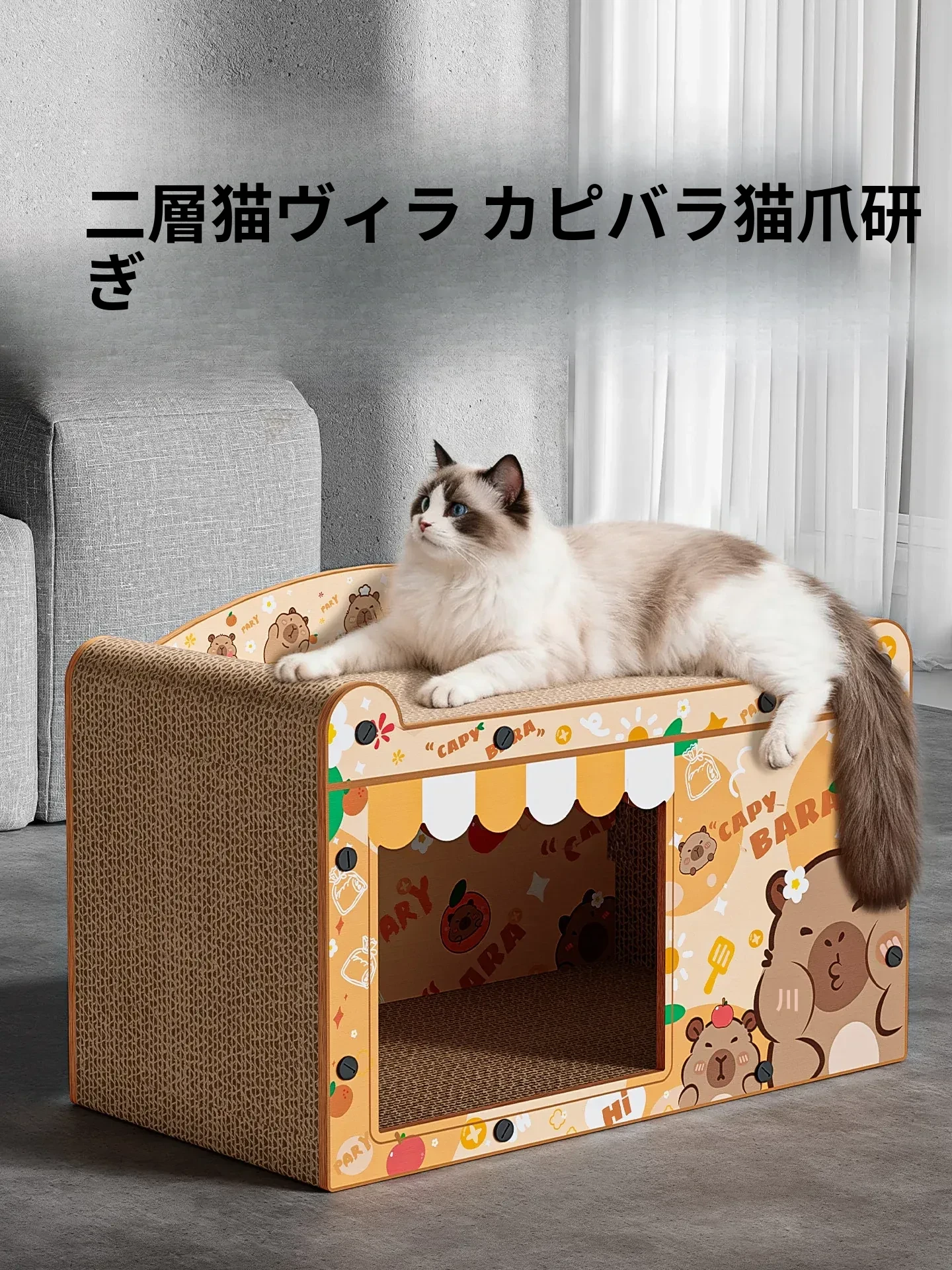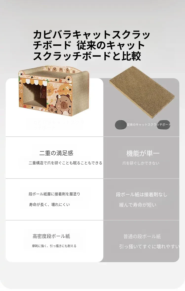 カピバラデザインの一体型キャットハウス&爪とぎボード!耐久性抜群、可愛いカートゥーンスタイルで、ソファを守りつつ猫ちゃんも大満足!波形段ボール製の楽しい猫おもちゃです。