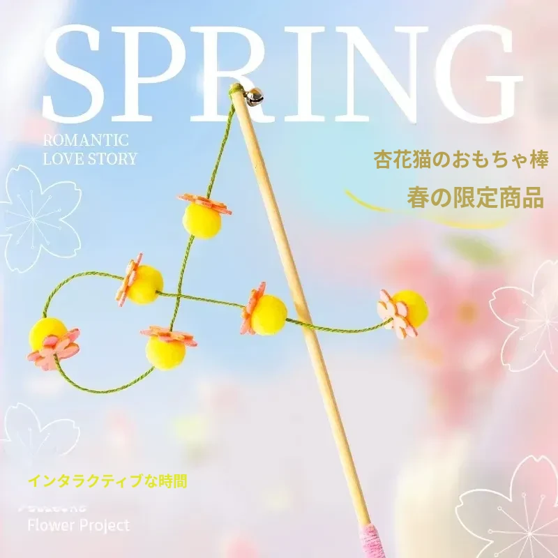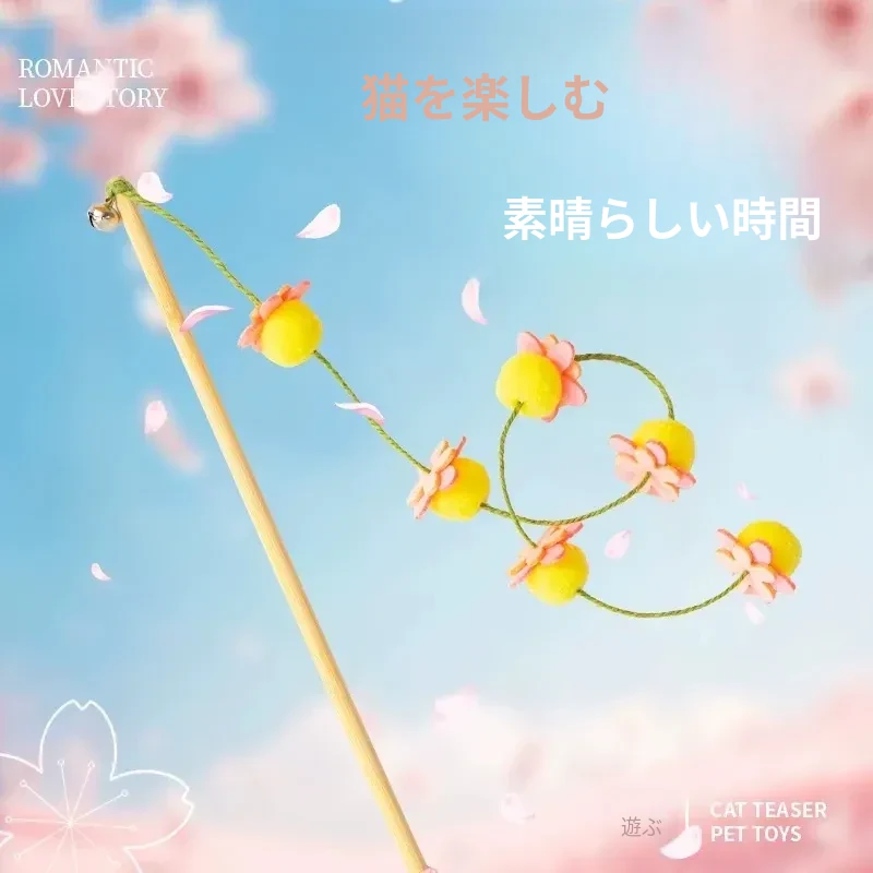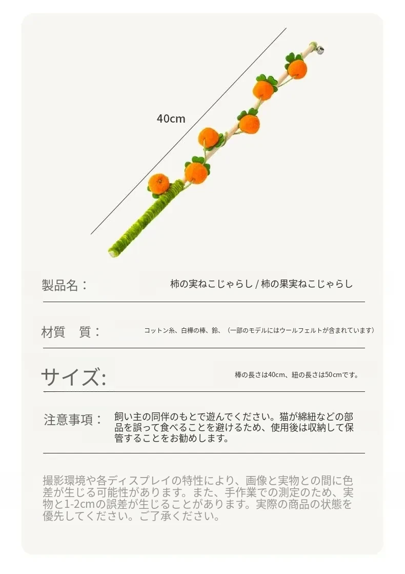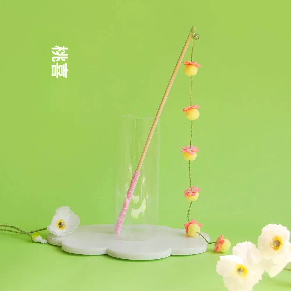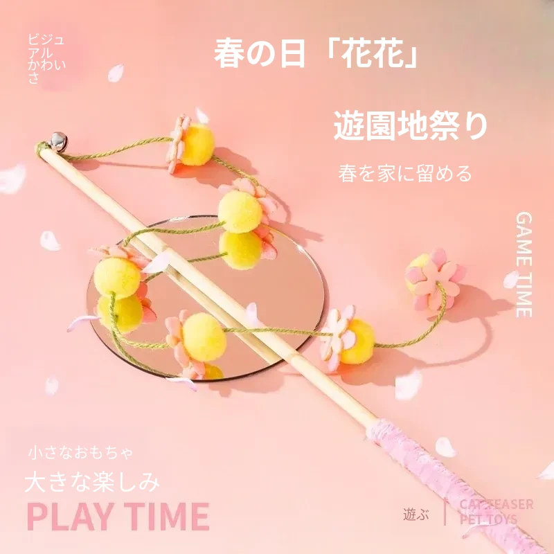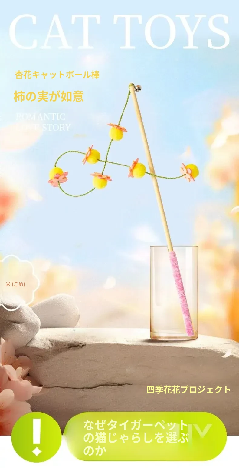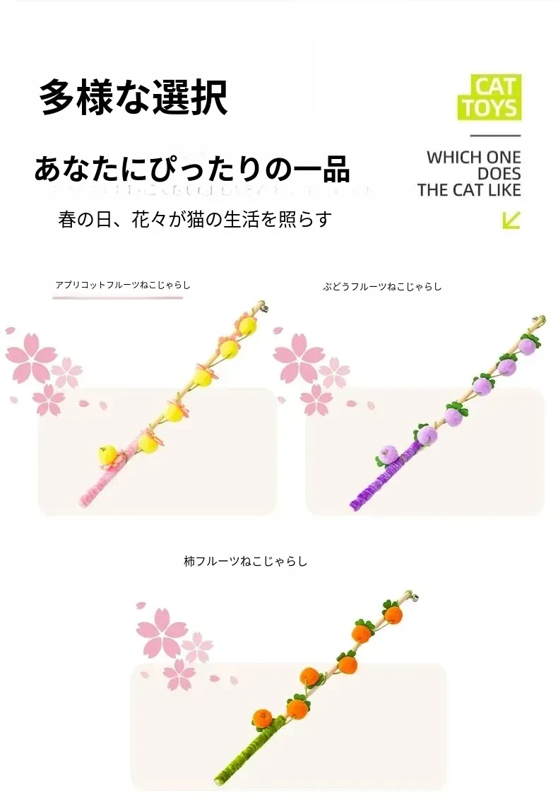猫のおもちゃ|木製ロングスティック付き猫じゃらし|噛んでも壊れない!猫ちゃんのストレス解消&運動不足解消に最適なアイテム!子猫も大満足の楽しさ!