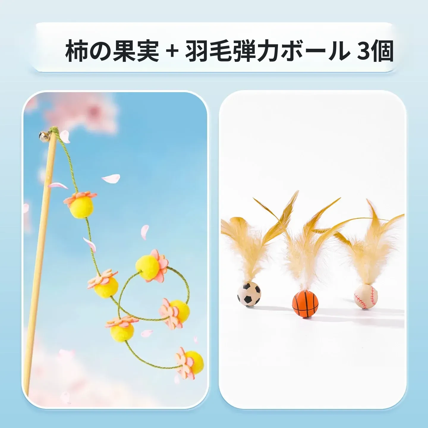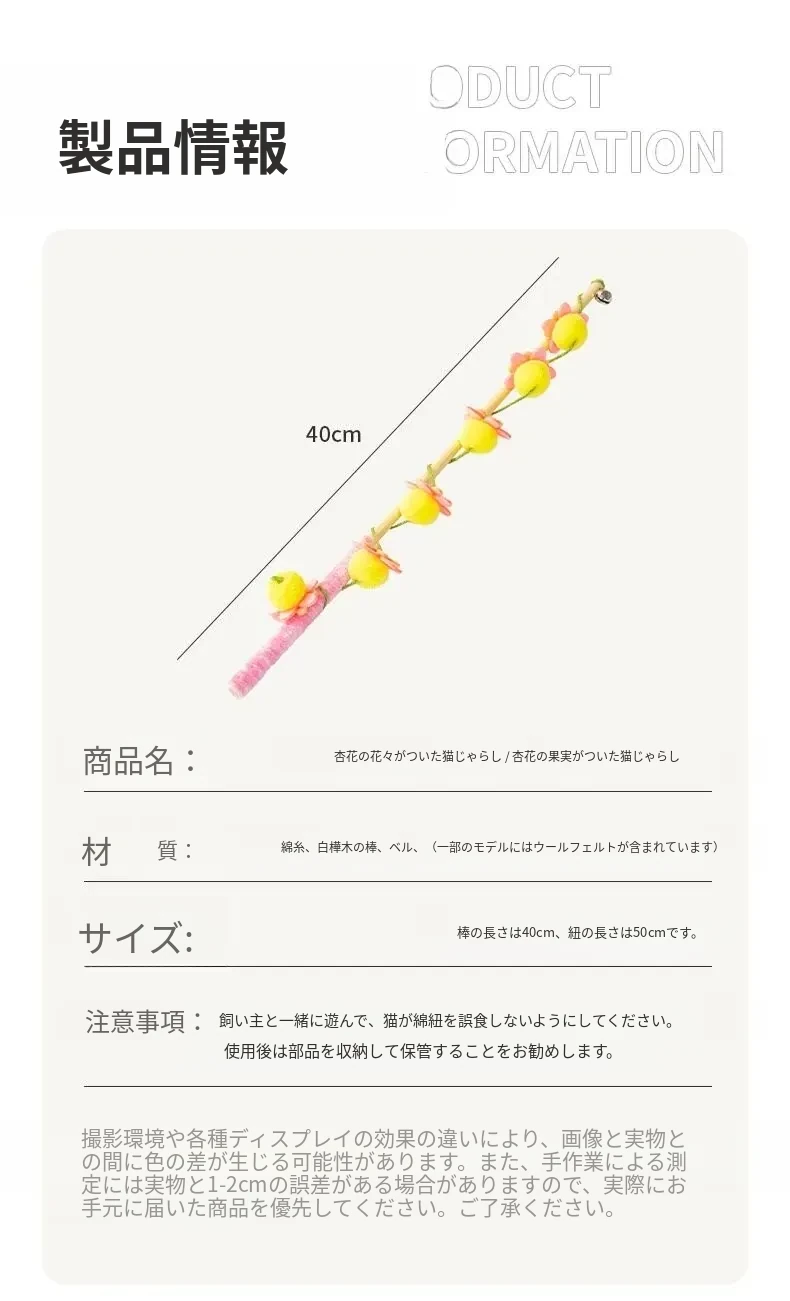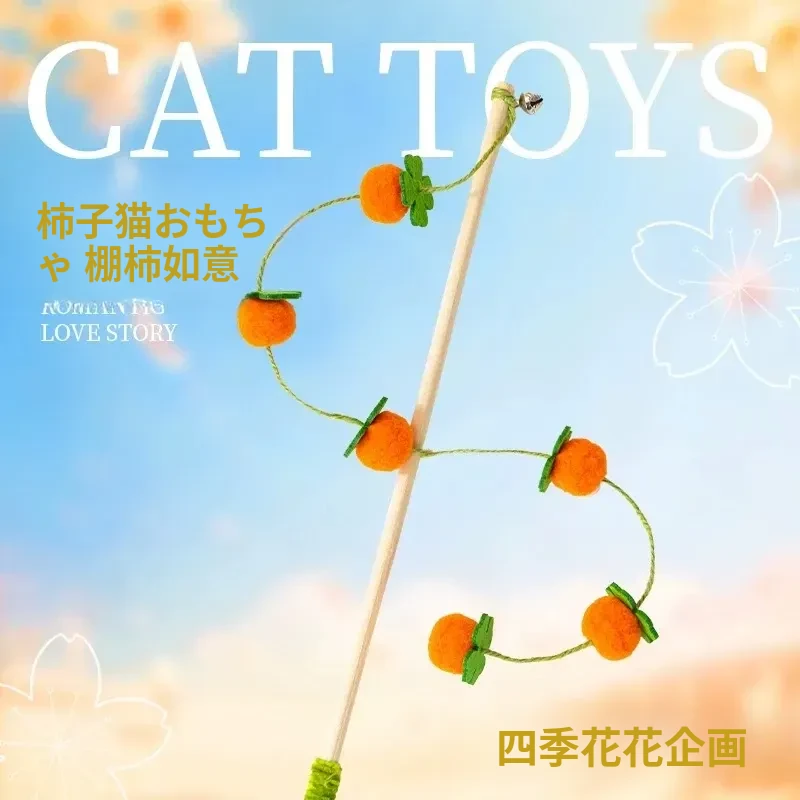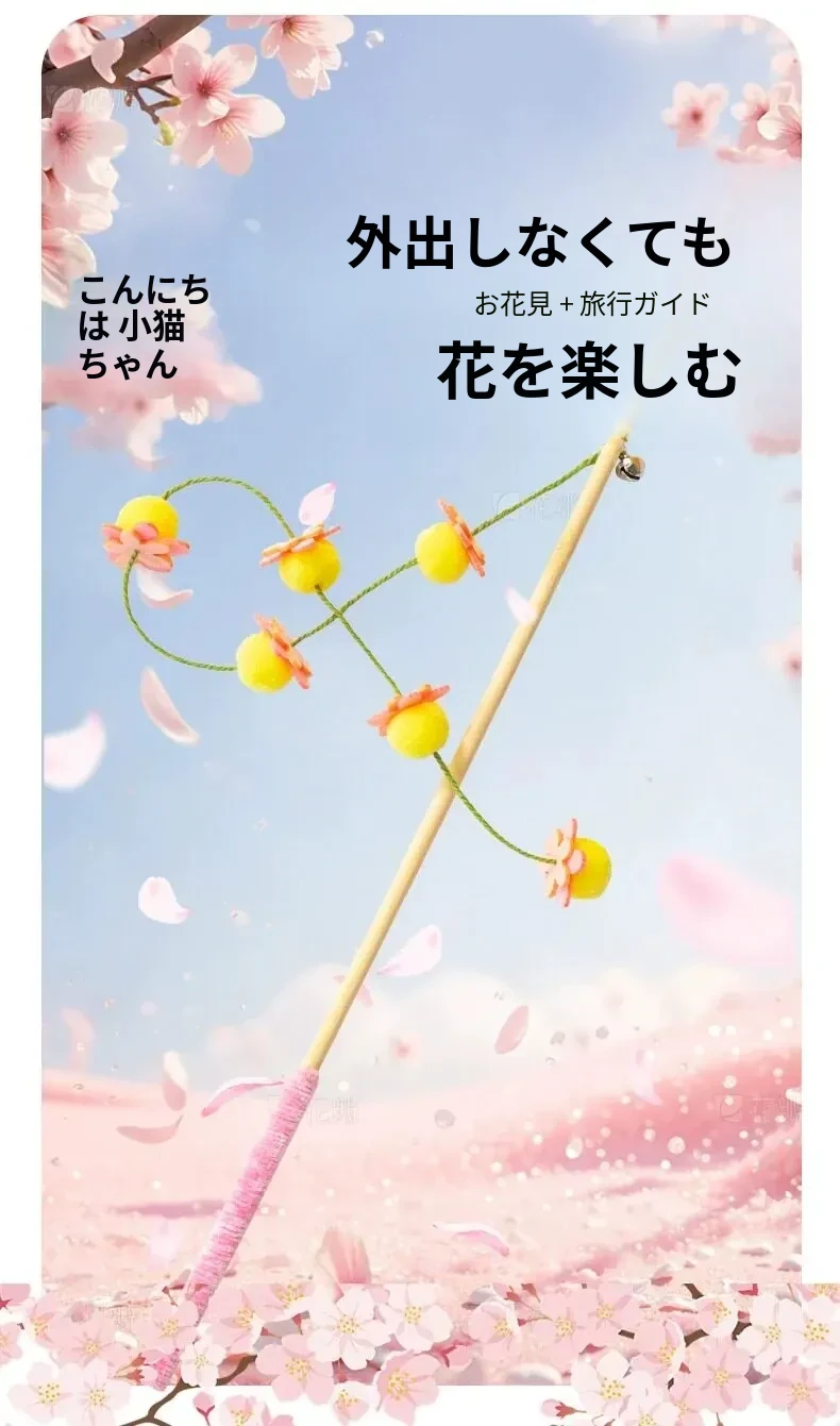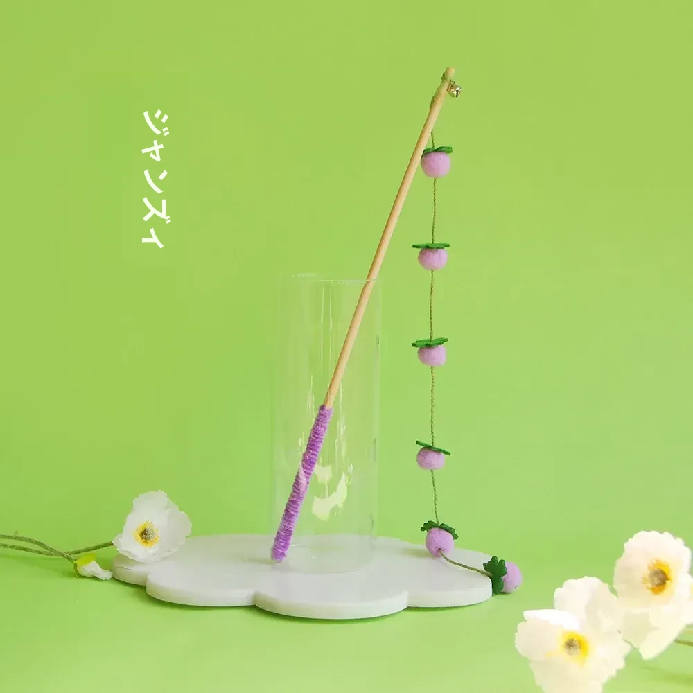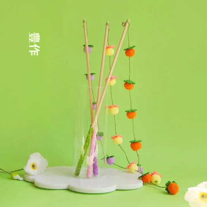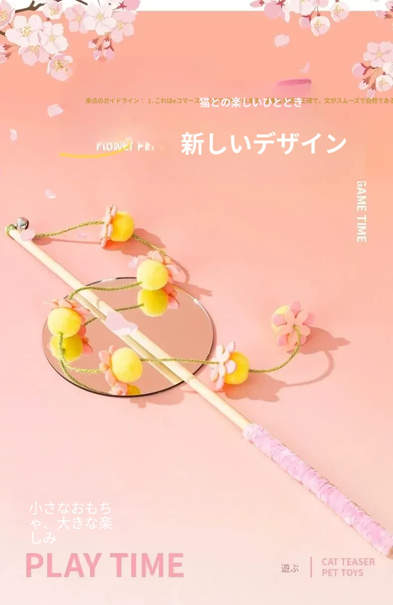 猫のおもちゃ|木製ロングスティック付き猫じゃらし|噛んでも壊れない!猫ちゃんのストレス解消&運動不足解消に最適なアイテム!子猫も大満足の楽しさ!