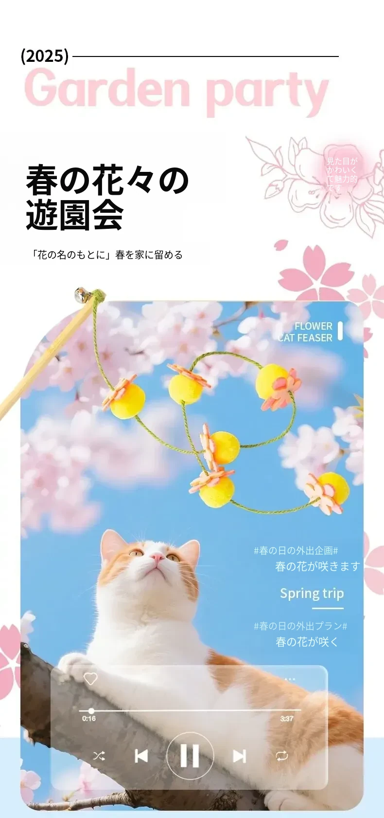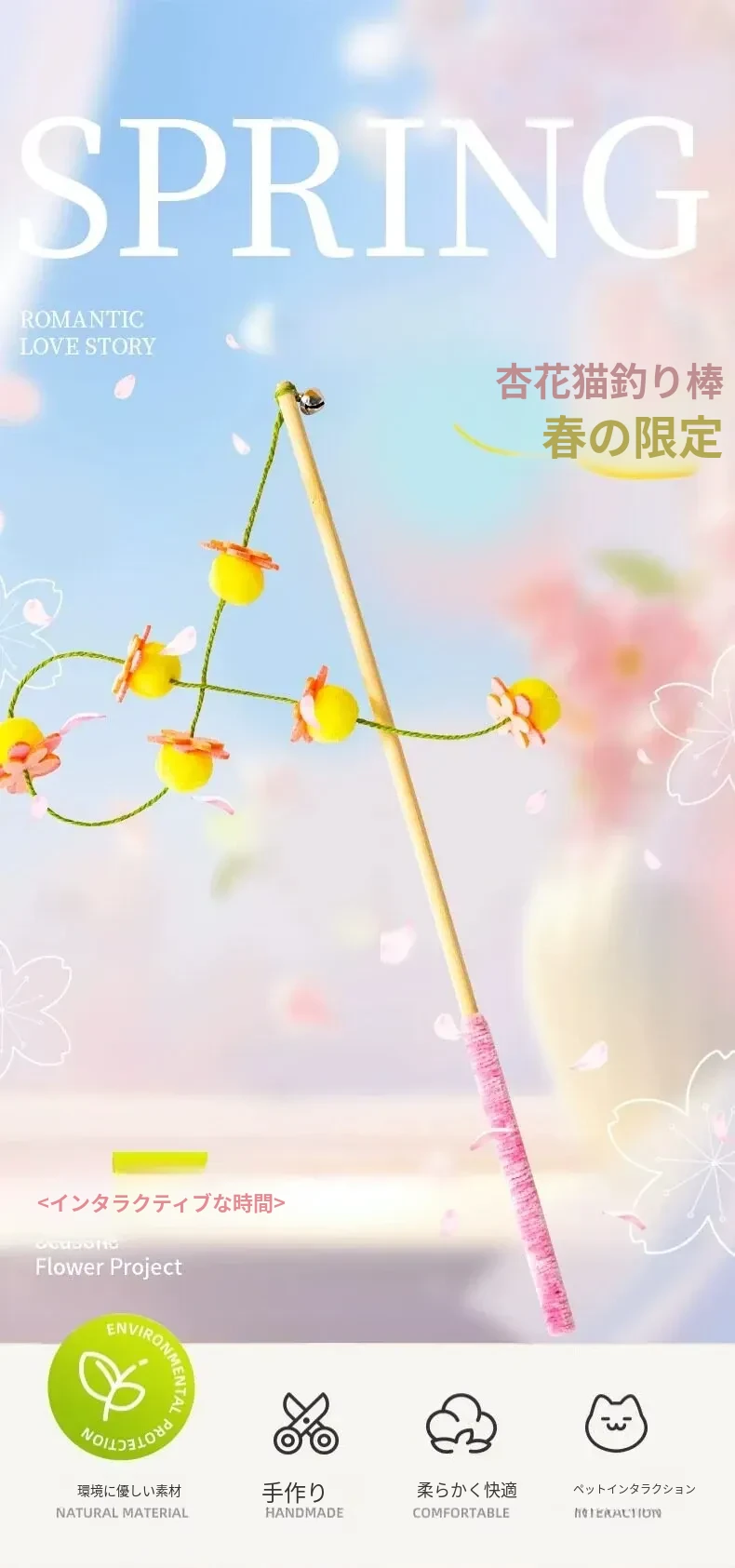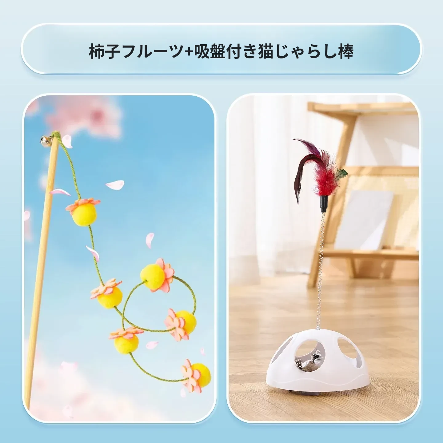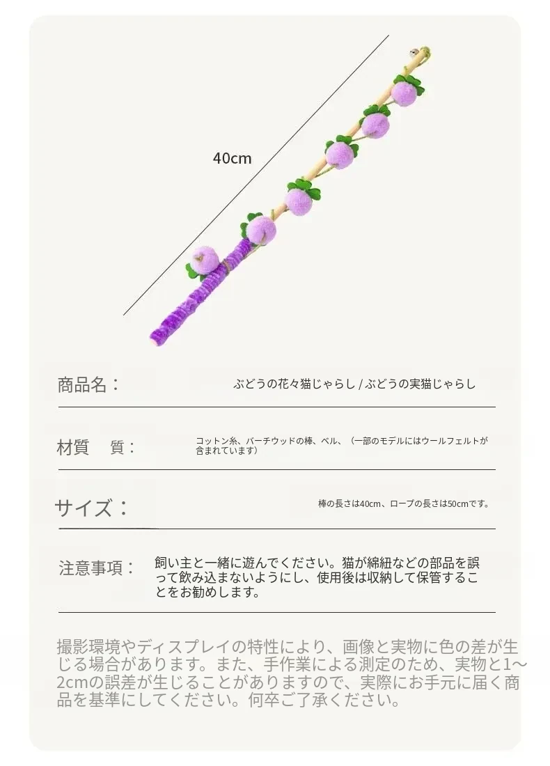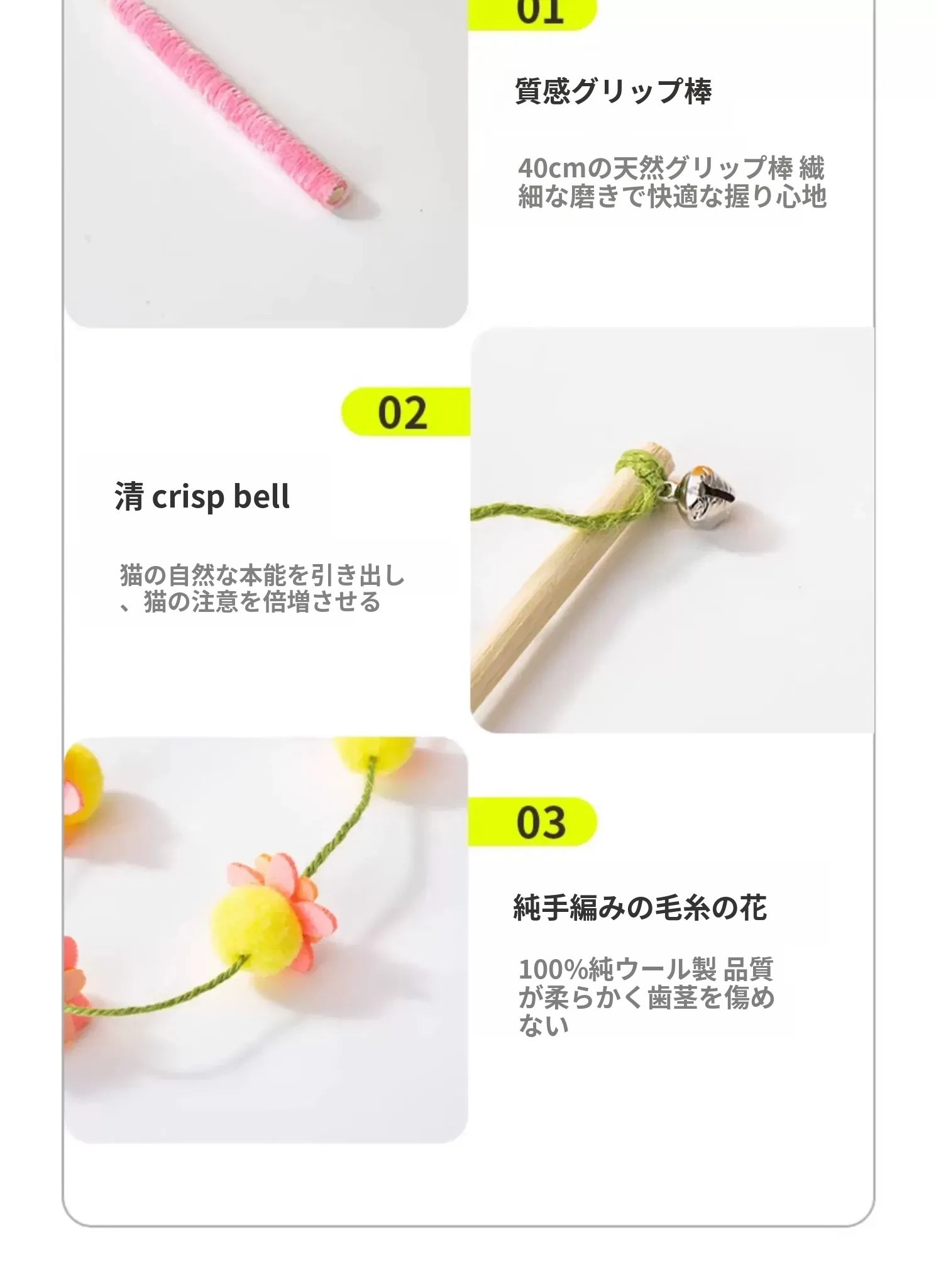 猫のおもちゃ|木製ロングスティック付き猫じゃらし|噛んでも壊れない!猫ちゃんのストレス解消&運動不足解消に最適なアイテム!子猫も大満足の楽しさ!