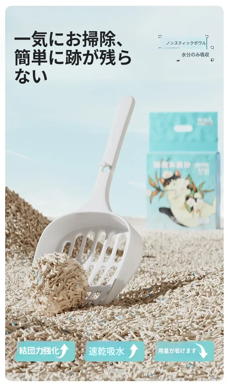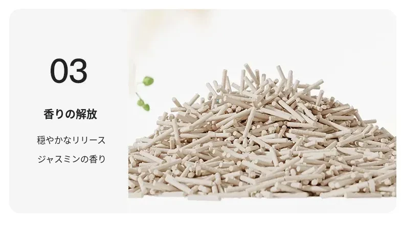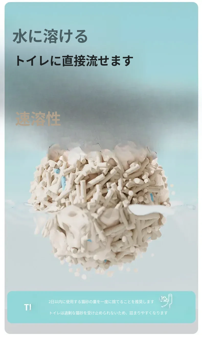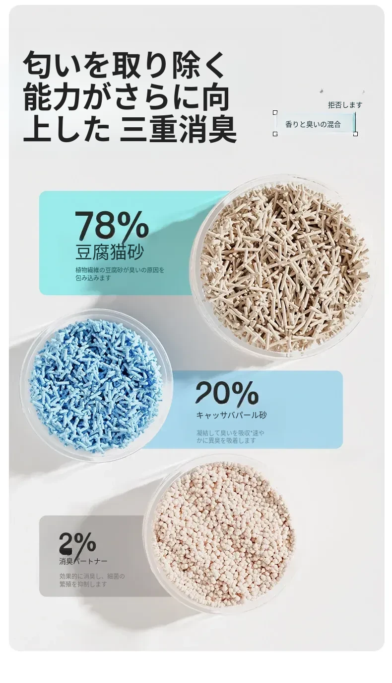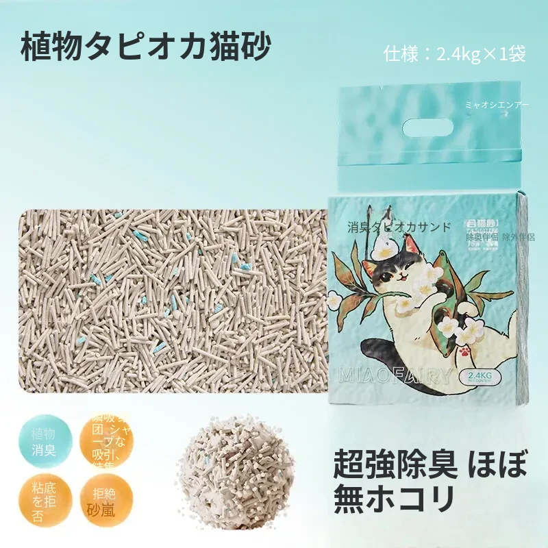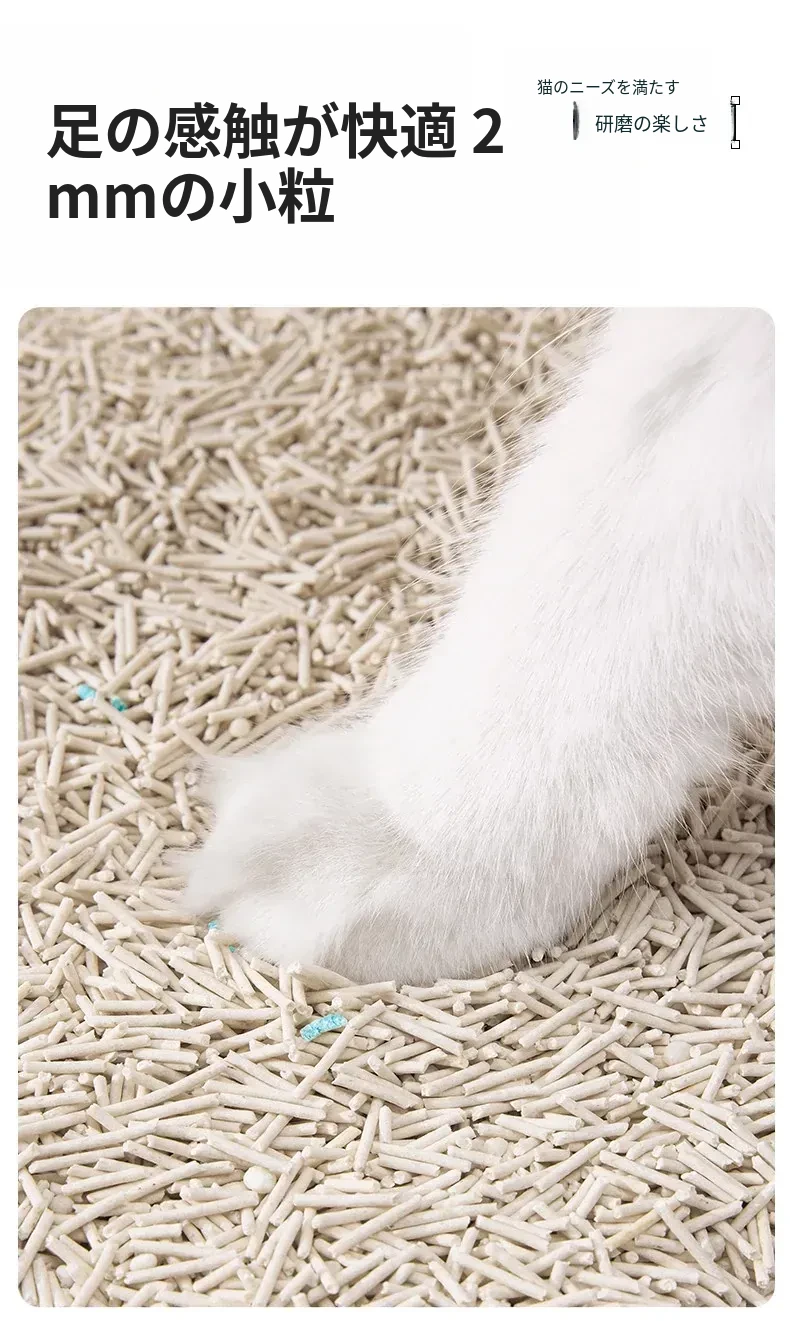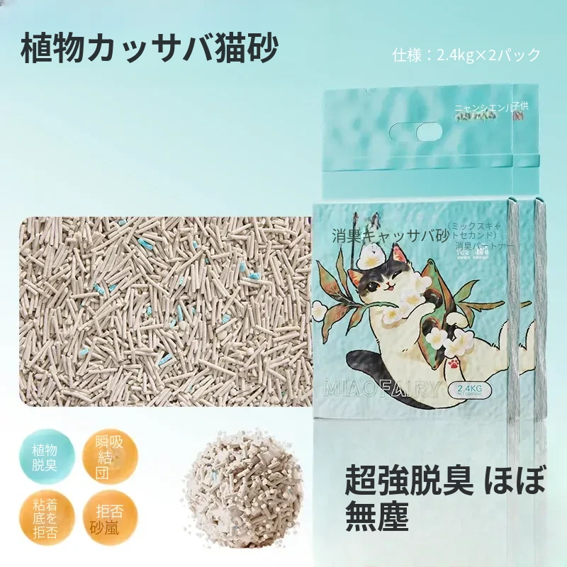 無臭・ほぼ無粉塵のキャッサバ猫砂!吸水性抜群で、底にくっつかない!猫ちゃん専用の混合豆腐砂で、ペット用品の新定番!快適なトイレ環境を提供します。