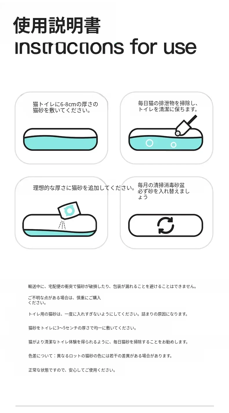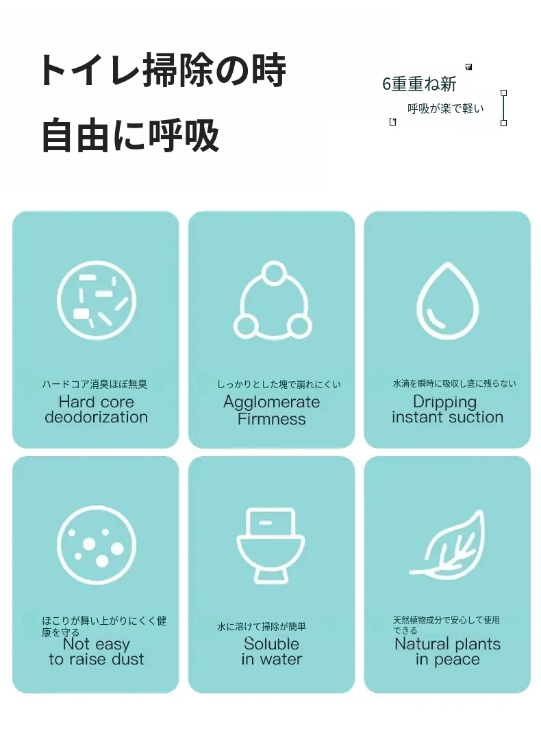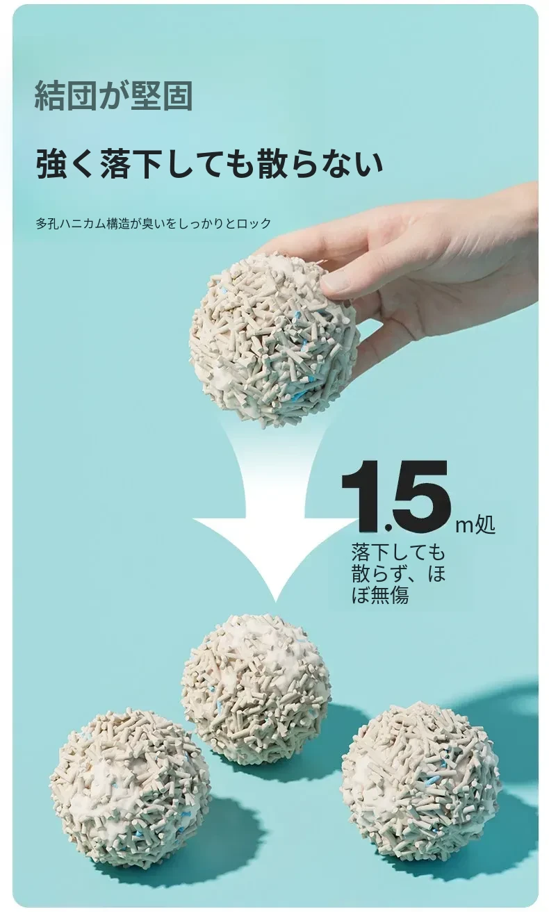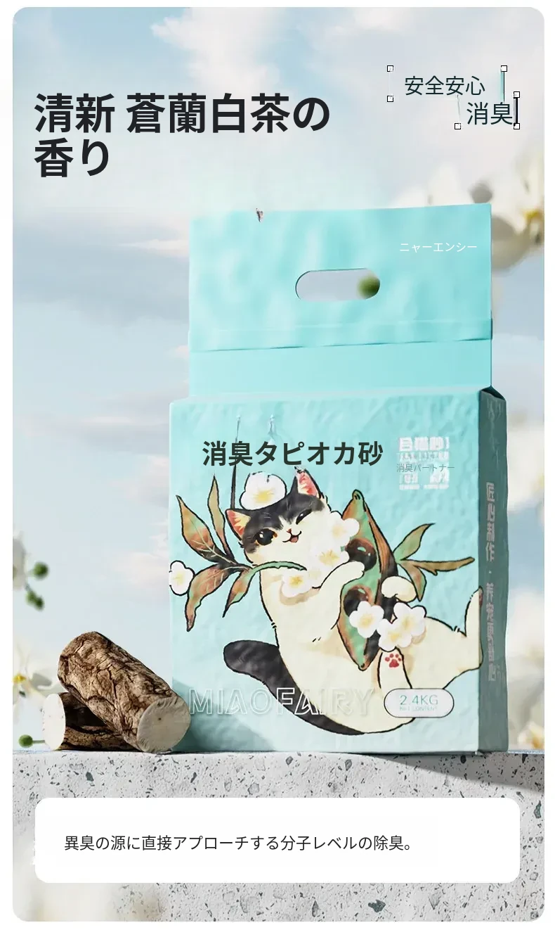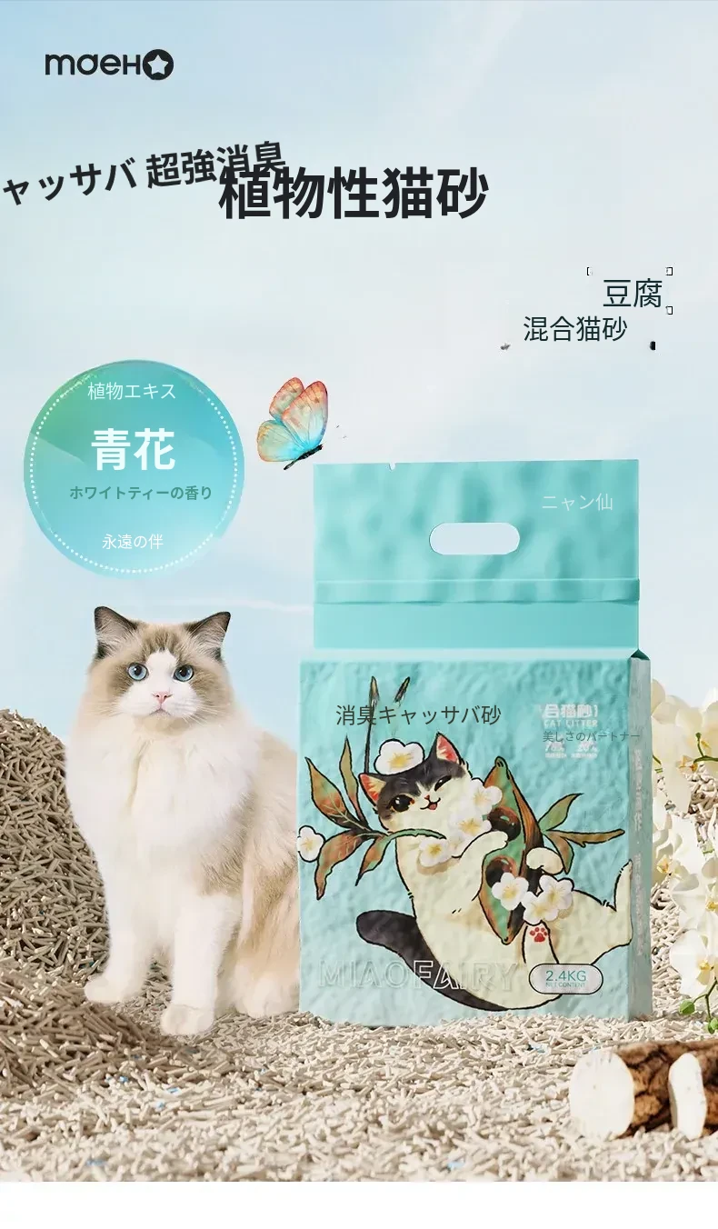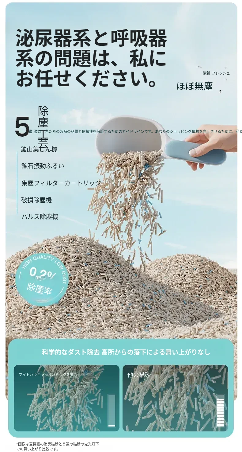 無臭・ほぼ無粉塵のキャッサバ猫砂!吸水性抜群で、底にくっつかない!猫ちゃん専用の混合豆腐砂で、ペット用品の新定番!快適なトイレ環境を提供します。